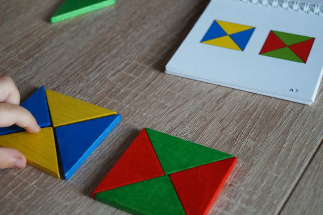 Drewniane klocki w kształtach trójkąta i rombu to pomoc w rozwijaniu zabawy figurami, myślenia przestrzennego, ćwiczenie skupienia, komponowania własnych wzorów lub wzorowania się na podanych w książeczce zadaniach. To zabawa w szukanie błędu, niezgodności z wzorem, liczenie i dokładanie brakujących figur.